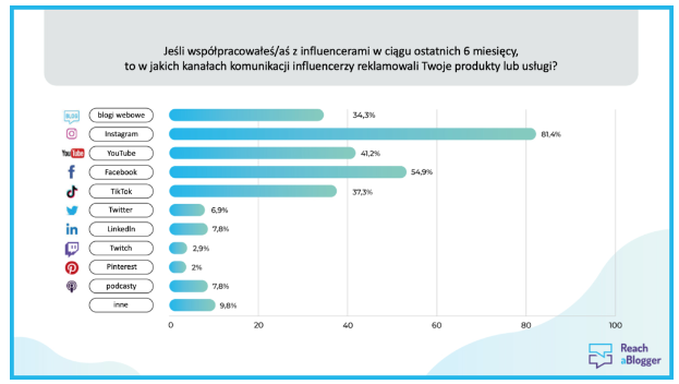 Działania z zakresu influencer marketingu widoczne są niemal na każdym kanale społecznościowym, jednak jak wynika z raportu „Rynek influencerów w Polsce - 2022”, opartego na badaniu, które przeprowadziła platforma ReachABlogger.pl, najczęściej wykorzystywaną platformą do promocji produktów jest Instagram. W Top 3 znalazły się także Facebook oraz YouTube.