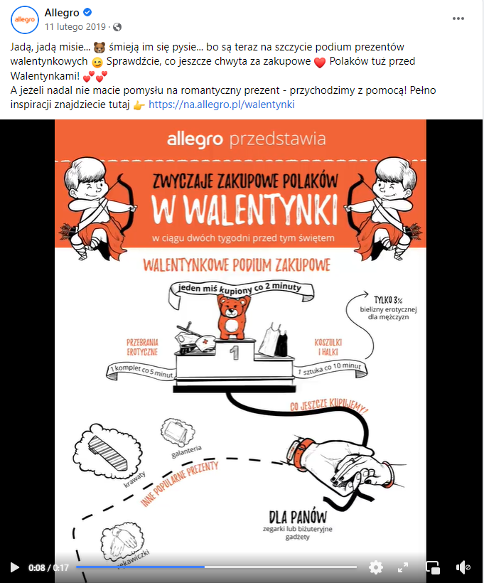 Trzy lata temu Allegro z okazji Walentynek zrobiło podsumowanie najczęściej kupowanych prezentów w postaci wideo połączonego z formą ciekawej notatki wizualnej. W treści posta odesłano do portalu po więcej inspiracji.