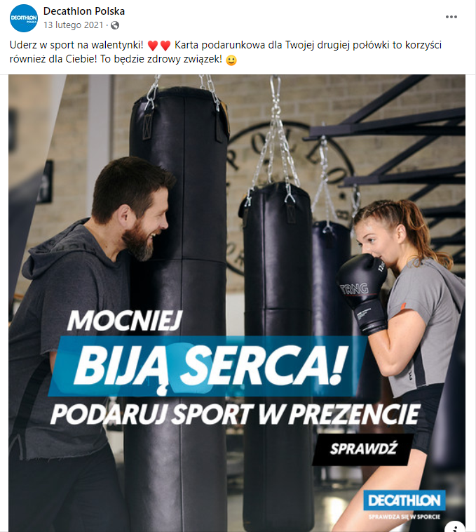 Kolejny przykład to marka Decathlon, która udowadnia, że i jej produkty też sprawdzą się na Walentynki, bo kto z nas nie chce żyć w zdrowym związku?