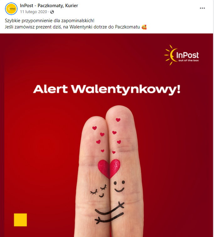 InPost słynie ze świetnej komunikacji z klientami i nic dziwnego, bo to, co robi, robi naprawdę dobrze. W zeszłym roku tak przypominał swoim klientom o walentynkowych prezentach na swoim fanpage’u na Facebooku.
