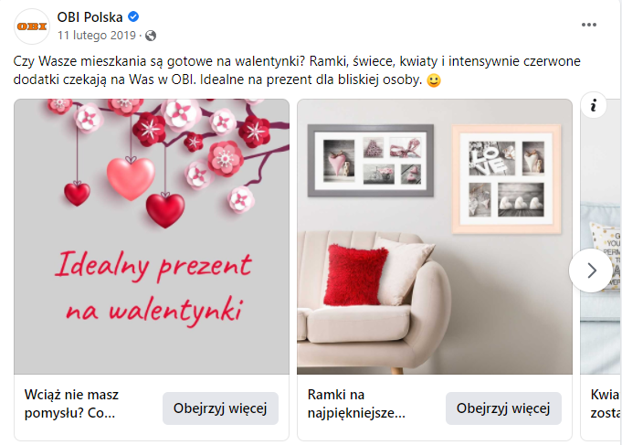 Kolejny sklep, który udowadnia, że promocja na Walentynki nie zna granic to OBI. Dwa lata temu zachęcał na swoim fanpage do przygotowania mieszkania na tę okazję, polecając dodatki ze swojej oferty.