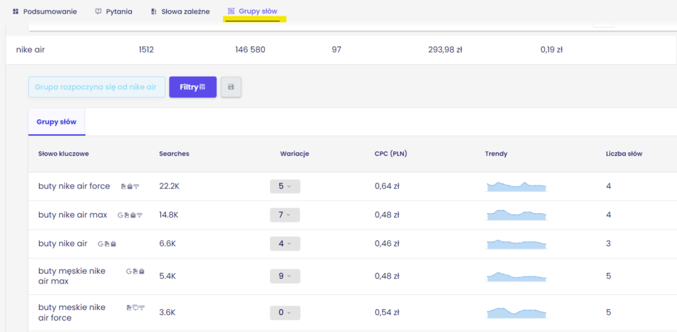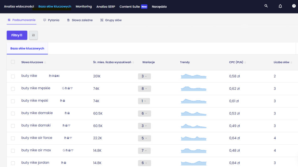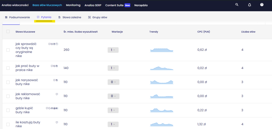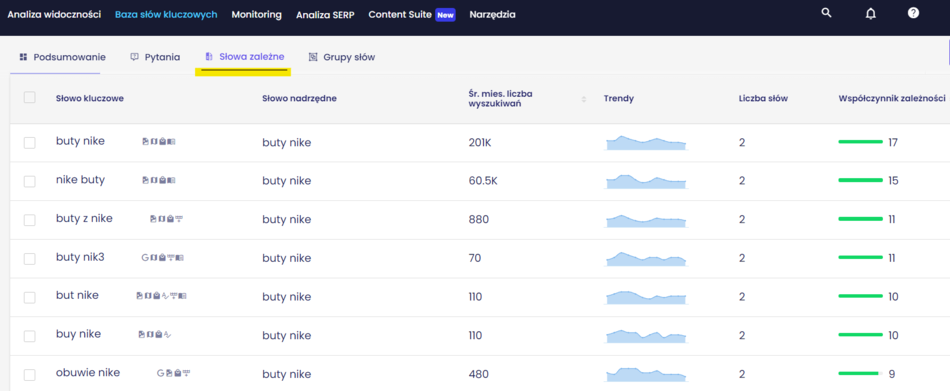 To kolejne bardzo przydatne narzędzie, które można wykorzystać do doboru fraz kluczowych. Warto sprawdzać zakładkę „Baza słów kluczowych”. Po wpisaniu frazy lub kilku fraz można sprawdzić ich wykaz w zakładce „Podsumowanie”, zakładce „Pytania”, „Słowa zależne” czy „Grupy słów”.