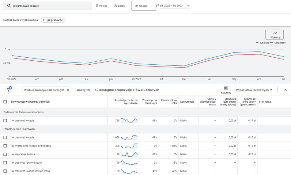 - Uwzględnienie sezonowości wyszukiwań – warto również sprawdzać sezonowość wyszukiwań fraz, zwłaszcza w branżach sezonowych. Frazy sezonowe powiązane są z konkretnymi okresami, wydarzeniami, trendami czy świętami. Z punktu widzenia content marketingu, uwzględnienie sezonowości fraz w procesie ich doboru, pomoże w zaplanowaniu odpowiedniej strategii contentowej. Dzięki temu można dostarczyć użytkownikom treści aktualnych i popularnych w danym okresie.