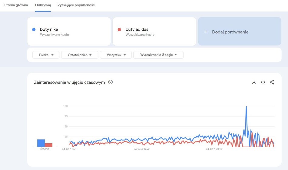- Frazy zasięgowe (generyczne) – to ogólne, szerokie słowa kluczowe np. „buty sportowe”. Generują dużą ilość ruchu, ale są bardziej konkurencyjne. Użytkownicy wpisujący takie frazy w wyszukiwarkę, często znajdują się na wczesnym etapie ścieżki zakupowej (dopiero zaczynają poszukiwania, porównują różne opcje).