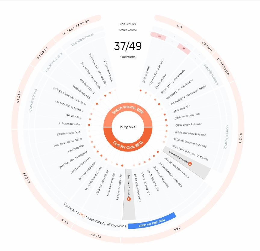 Narzędzie to pomaga znaleźć powiązane danym tematem pytania, które zadają użytkownicy. Jest bardzo przydatne zwłaszcza do odkrywania treści i tematów, które warto poruszyć. Prezentuje wyniki w formie graficznej chmury, w której można zobaczyć różne zapytania powiązane z tematem. Ponadto AnswerThePublic klasyfikuje pytania i zapytania na różne kategorie typu „kto”, „co”, „dlaczego”. Pomaga również znaleźć pomysły na nowe treści.