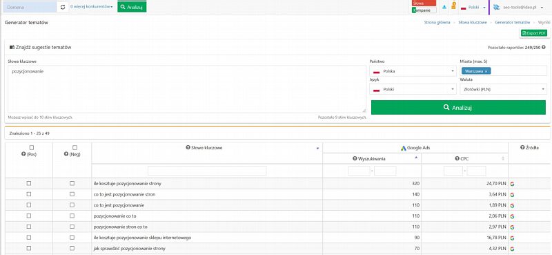 Warto także wspomnieć, że pomimo iż SEMSTORM jest narzędziem pochodzącym z polskiego rynku, operuje w 20 językach. Oznacza to, że zarówno analiza treści, podpowiedzi tematów i słów kluczowych mogą być dostarczane na przykład w języku angielskim, francuskim, niemieckim, włoskim i w wielu innych. Ponadto, istotne jest także to, że dla każdego kraju wyniki wyszukiwania oraz dane do analizy będą różne. Dla przykładu, przy wyborze języka angielskiego najpopularniejszą wyszukiwarką nie będzie już Google, a Bing.