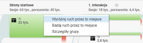 Dzięki opcji „Badaj ruch przez to miejsce” zobaczyć można podstrony bezpośrednio prowadzące do tego konkretnego punktu (zestawu podstron) oraz bezpośredni następny krok. Z kolei „Wyróżnij ruch przez to miejsce”, pozwoli przyjrzeć się całościowemu przepływowi użytkowników w określonej ścieżce.