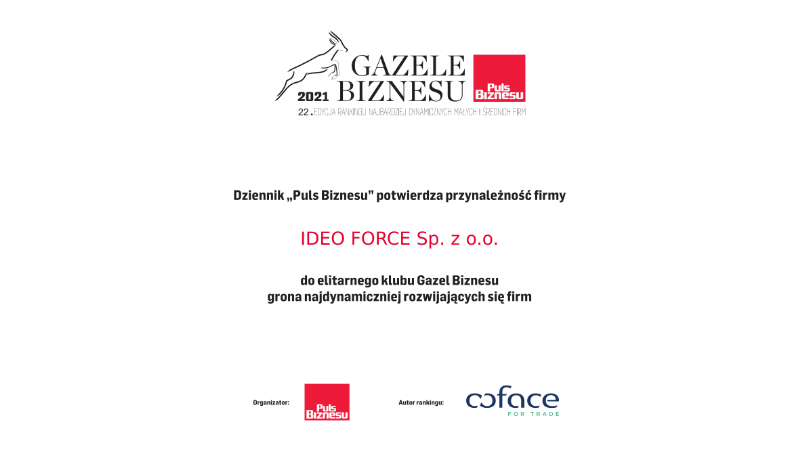 Miło nam poinformować, że Ideo Force zostało wyróżnione przez Puls Biznesu w prestiżowym rankingu Gazele Biznesu 2021.