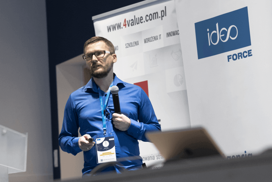 Następnie na scenie pojawił się przedstawiciel Ideo Force, Daniel Kazanecki — Content Manager, analityk i projektant strategii e-marketingowych. W prelekcji „Na skraju jutra. Rola analityki marketingowej w byciu przygotowanym na nieznane” podzielił się swoją wiedzą o podejściu do analizowania i planowania w zmiennym otoczeniu biznesowym.