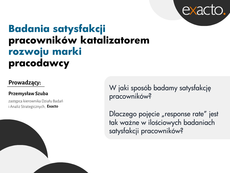Grudzień upłynął nam pod znakiem dwóch branżowych wydarzeń. Początkiem miesiąca, gdyż 7. grudnia zorganizowaliśmy bezpłatny webinar pt. Badania satysfakcji pracowników katalizatorem rozwoju marki. Wydarzenie poprowadził doświadczony ekspert z agencji PR Exacto – Przemysław Szuba. Przemysław opowiedział uczestnikom, jak przygotować profesjonalne badania opinii kadr w firmie, dzieląc się z nimi także specjalną checklistą, zawierającą pigułkę najważniejszych informacji, dotyczących tego typu badań.