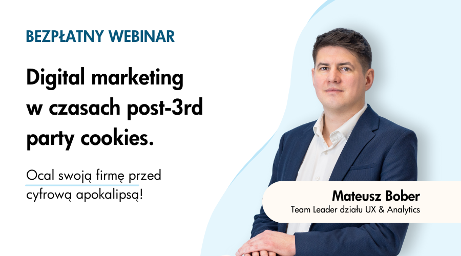 W grudniu zorganizowaliśmy ostatni chronologicznie, ale jeden z pierwszych pod kątem ważności webinar w tym roku, który poświęciliśmy przygotowaniom do ery cookieless. Było to wydarzenie pt. „Digital marketing w czasach post-3rd party cookies. Ocal swoją firmę przed cyfrową apokalipsą!”. Webinar poprowadził Team Leader działu UX & Analytics – Mateusz Bober.