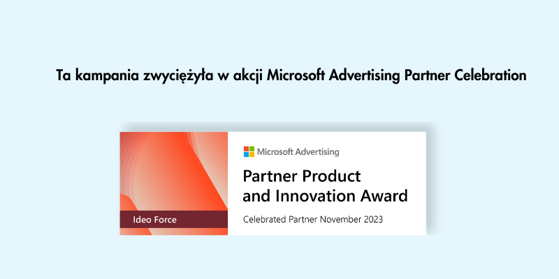 Jako Ideo Force należymy do programu Microsoft Advertising Partner, znajdując się w gronie agencji, świadczących wysokiej jakości usługi w zakresie Microsoft Ads. To właśnie dla uczestników tego programu Microsoft zorganizował rywalizację, w której wybierane są najlepiej realizowane kampanie reklamowe. Kampania, którą realizowaliśmy dla sklepkawa.pl doprowadziła nas do zwycięstwa w kategorii Product & Innovation, tym samym czyniąc nas jedną z trzech najlepszych agencji z całego świata, obsługujących kampanie w ekosystemie Microsoft Ads.