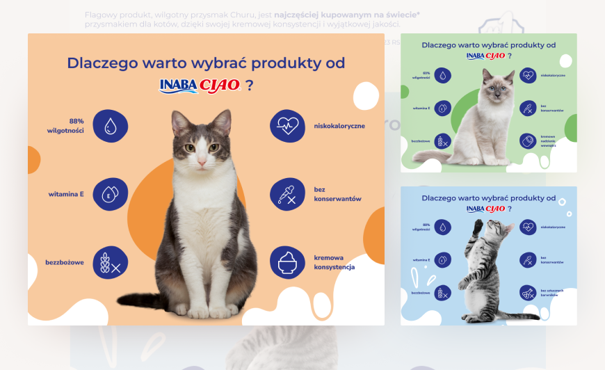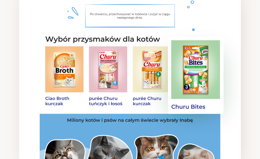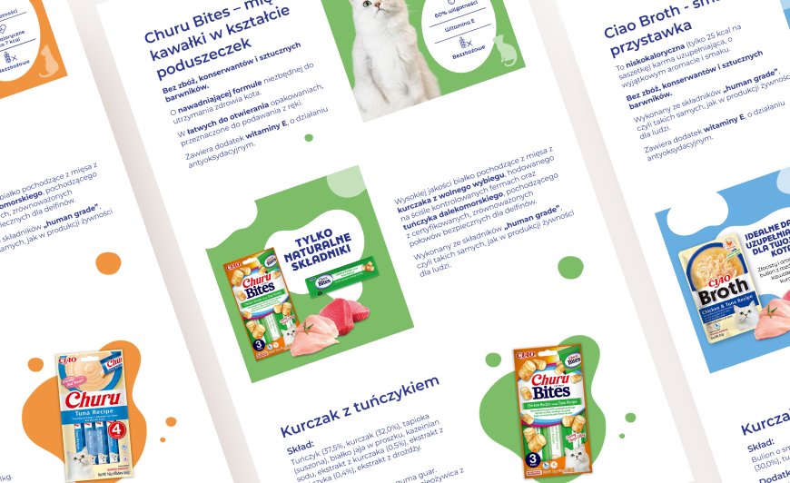 Nasz przepis na sukces objął trzy kluczowe linie produktów: Ciao Broth, Churu Bites i Purée. Opracowaliśmy dla nich spójne i responsywne szablony, które połączyły precyzyjny UX writing z apetyczną oprawą wizualną.