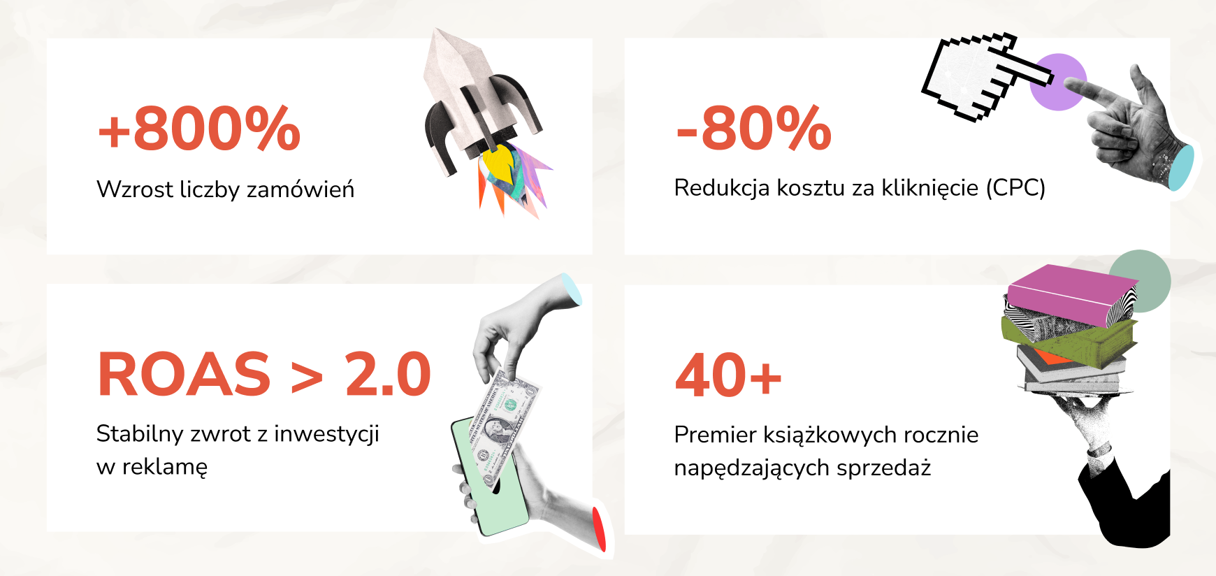 - Stworzenie rentownego silnika sprzedażowego opartego na ok. 40 premierach książkowych rocznie, wspieranych przez ponad 60 artykułów blogowych budujących pozycję eksperta.