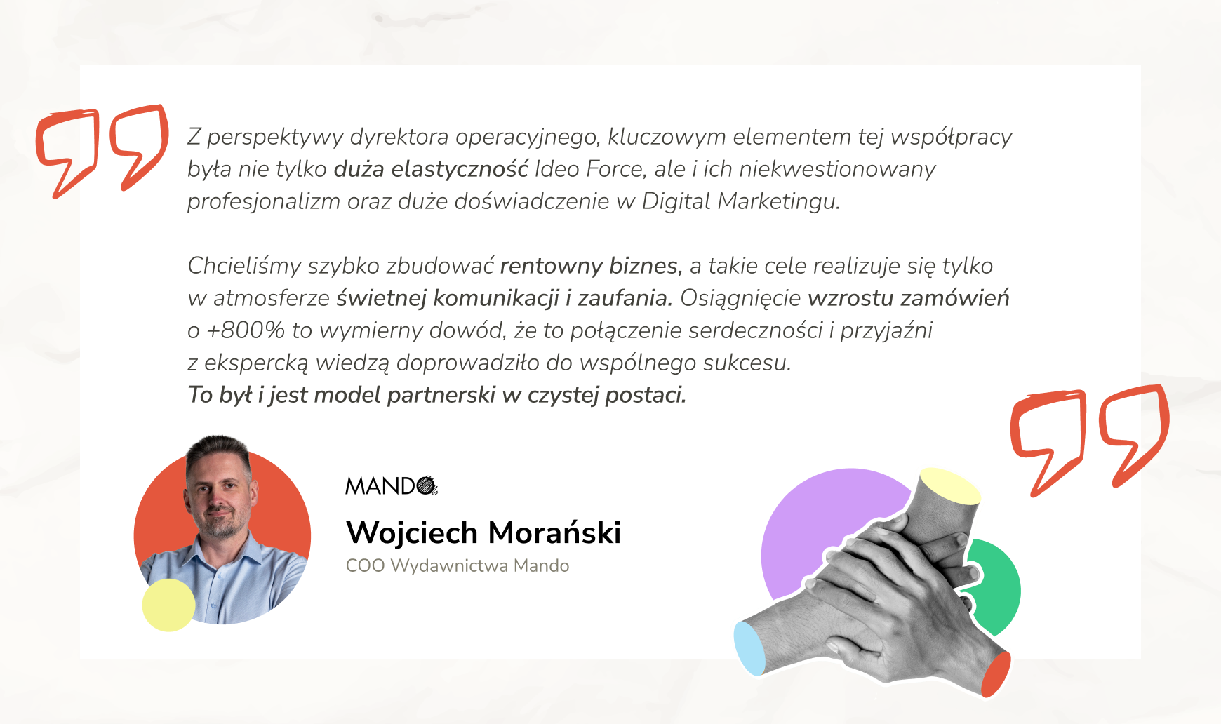 Współpraca z księgarnią Mando.pl to nie była typowa relacja agencja-klient. Staliśmy się zewnętrznym działem e-commerce, współtworząc i współzarządzając projektem na każdym etapie. Połączyliśmy głęboką znajomość rynku wydawniczego Klienta z naszą ekspertyzą w budowaniu biznesów online. Nasza decyzyjność i zaangażowanie wykraczały daleko poza standardową współpracę.