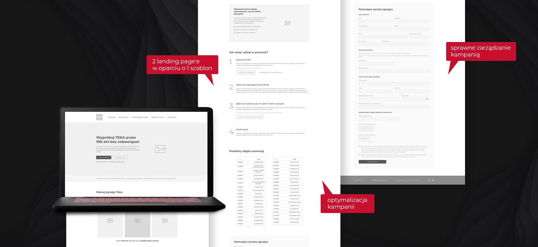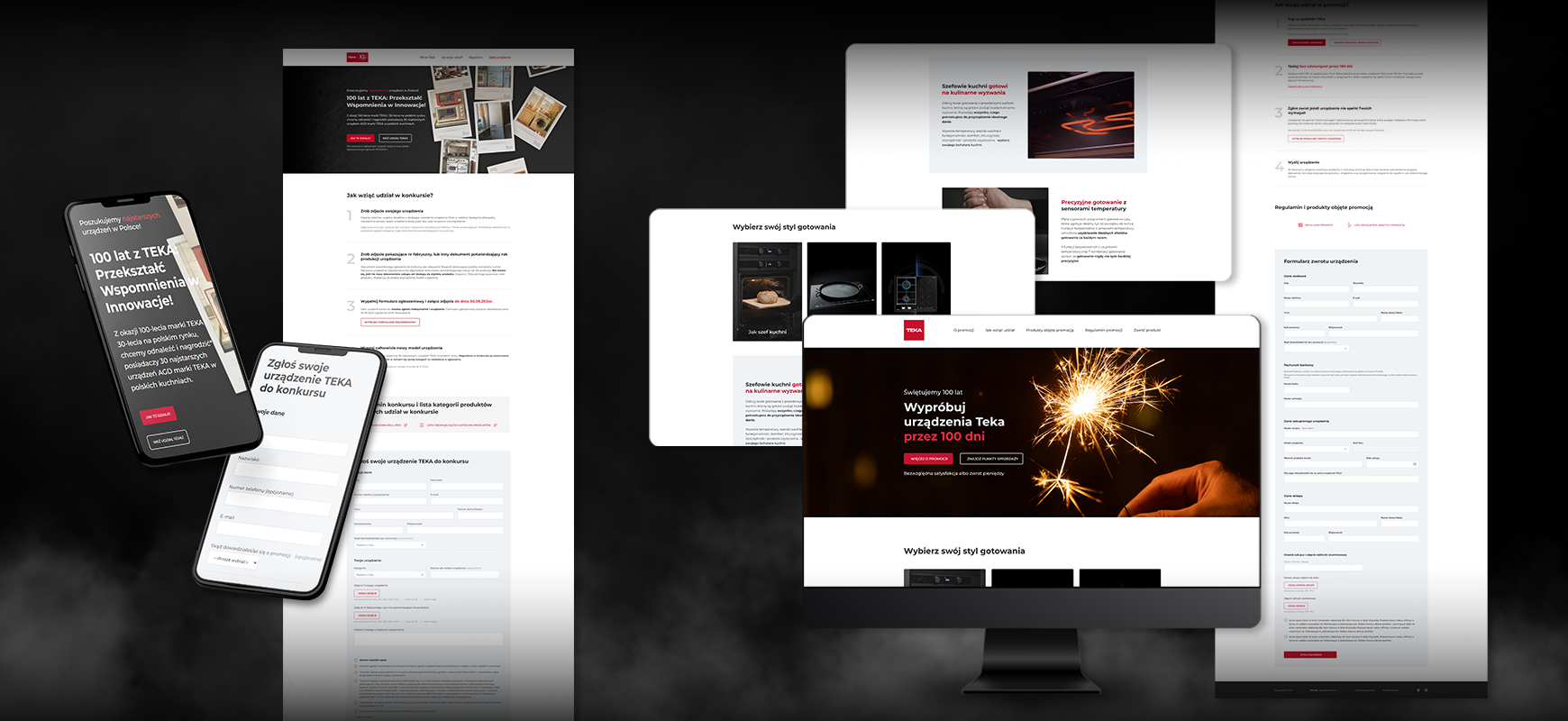 Z okazji setnych urodzin marki TEKA postanowiła „zgotować” coś specjalnego dla swoich klientów, przygotowując dwie kampanie: Naszym zadaniem było doprawienie tego przepisu, czyli zadbanie o skuteczną promocję w digitalu. W oparciu o starannie dobraną strategię marketingową, zaprojektowaliśmy kampanię, która bazowała na kilku kluczowych składnikach. Po pierwsze, stworzyliśmy dwa landing page'e w oparciu o jeden szablon, co pozwoliło nam na sprawne zarządzanie i optymalizację kampanii. Było to jak przygotowanie bulionu – uniwersalnej bazy, która mogła być zastosowana w różnych kontekstach, w zależności od potrzeb użytkowników. Cały landing page został wzbogacony o sekcję wideo, prezentującą różnorodność oferty TEKA, by każdy klient mógł znaleźć sprzęt odpowiadający jego potrzebom. Opracowaliśmy również przejrzystą sekcję instruktażową, która krok po kroku wyjaśniała, jak wziąć udział w promocji lub konkursie, dodając kontekstowe odnośniki do odpowiednich podstron. W kolejnym kroku stworzyliśmy projekt interfejsu użytkownika (UI), który wizualnie zmaterializował kluczowe elementy brandingu TEKA i nadał ostateczny wygląd landing page'owi. Projekt UI zawierał m.in. hero image, który od razu przyciągał uwagę subnagłówkiem informującym o 100 latach działalności, nagłówkiem komunikującym możliwość 100-dniowego testowania sprzętu AGD, a także wyraźnym CTA. Dodatkowo, umieściliśmy komunikat wzmacniający ofertę: „Bezwzględna satysfakcja albo zwrot pieniędzy”. Na tym jednak nie zakończyliśmy działań. Kampanie w mediach społecznościowych oraz Google Ads były kolejnym istotnym składnikiem przepisu na sukces. Dzięki precyzyjnemu targetowaniu, docieraliśmy z komunikatem do osób, które mogły być najbardziej zainteresowane ofertą. Dla kampanii konkursowej skoncentrowaliśmy się na osobach posiadających sprzęt TEKA, natomiast w promocji skierowaliśmy się do osób planujących zakup nowoczesnej płyty indukcyjnej. Kampanie opieraliśmy na platformach takich jak Facebook, Google Ads oraz WP Ads, aby maksymalnie zwiększyć zasięg i zaangażowanie odbiorców. W zakres działań wchodziły m.in. reklamy promujące rolki wideo, posty angażujące użytkowników, kampanie w Google Display Network oraz działania oparte na Demand Gen. Naszym celem było dotarcie do jak najszerszej grupy potencjalnie zainteresowanych osób, przy jednoczesnym precyzyjnym dostosowaniu komunikacji do specyfiki kampanii. Całość została przyprawiona szczyptą kreatywności, co sprawiło, że komunikacja była nie tylko skuteczna, ale także angażująca i wyróżniająca się na tle konkurencji. Urodzinowe danie marki TEKA okazało się prawdziwym przebojem: Kampanie na Facebooku okazały się niezwykle efektywne pod względem generowania zaangażowania i odtworzeń wideo, co pomogło nam budować silniejszą więź z konsumentami oraz zwiększyć zainteresowanie marką. Z kolei działania w Google Ads przyniosły imponujący zasięg oraz liczbę kliknięć, co pozwoliło na efektywne budowanie świadomości dotyczącej promocji oraz jej zasad w grupie docelowej. Landing page'e zostały utworzone na CMS-ie WordPress. W zakres działań, oprócz wdrożenia dedykowanej szaty graficznej, wchodziło również przygotowanie mechanizmu pozwalającego na łatwe zarządzanie wysłanymi przez użytkowników zgłoszeniami. Mechanizm ten obejmował: Landing page'e zostały dostosowane do różnych rozdzielczości, a modułowa budowa umożliwia wykorzystanie szablonu również przy budowie kolejnych landing page'y w przyszłości, co znacznie obniża potencjalne nakłady pracy. Ten jubileuszowy przepis pokazał, że nawet marka ze stuletnim doświadczeniem może zaserwować świeże podejście do komunikacji z klientami. Wspólnie, łącząc tradycję z nowoczesnością, podaliśmy kampanię, która nie tylko wzmocniła wizerunek marki, ale też zaangażowała klientów w wyjątkowy sposób. Wyzwanie